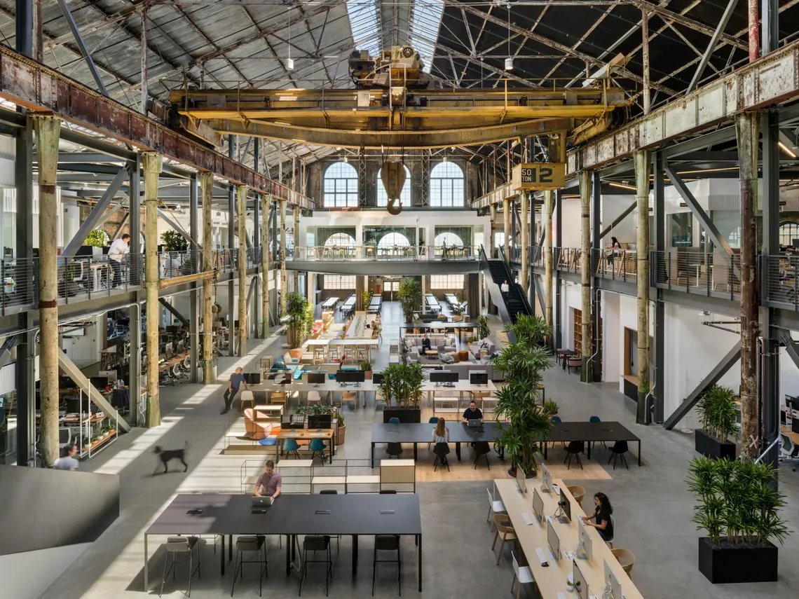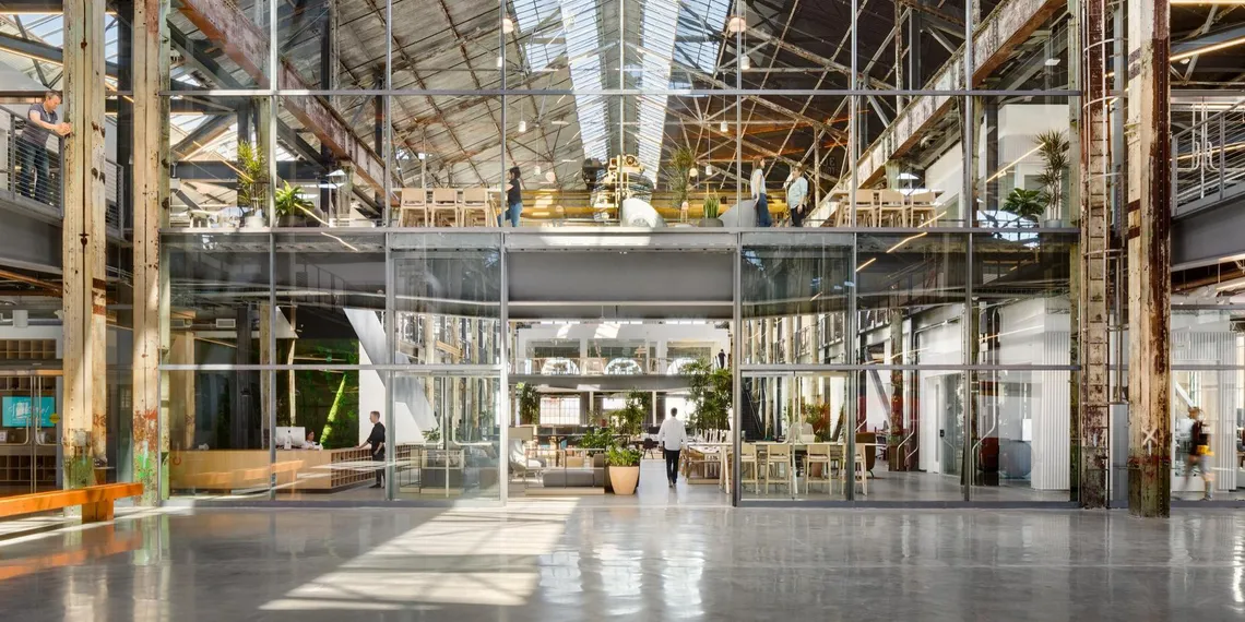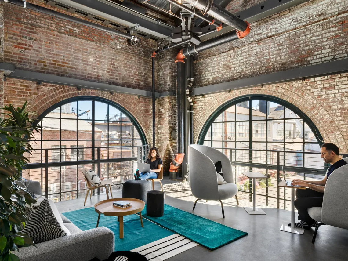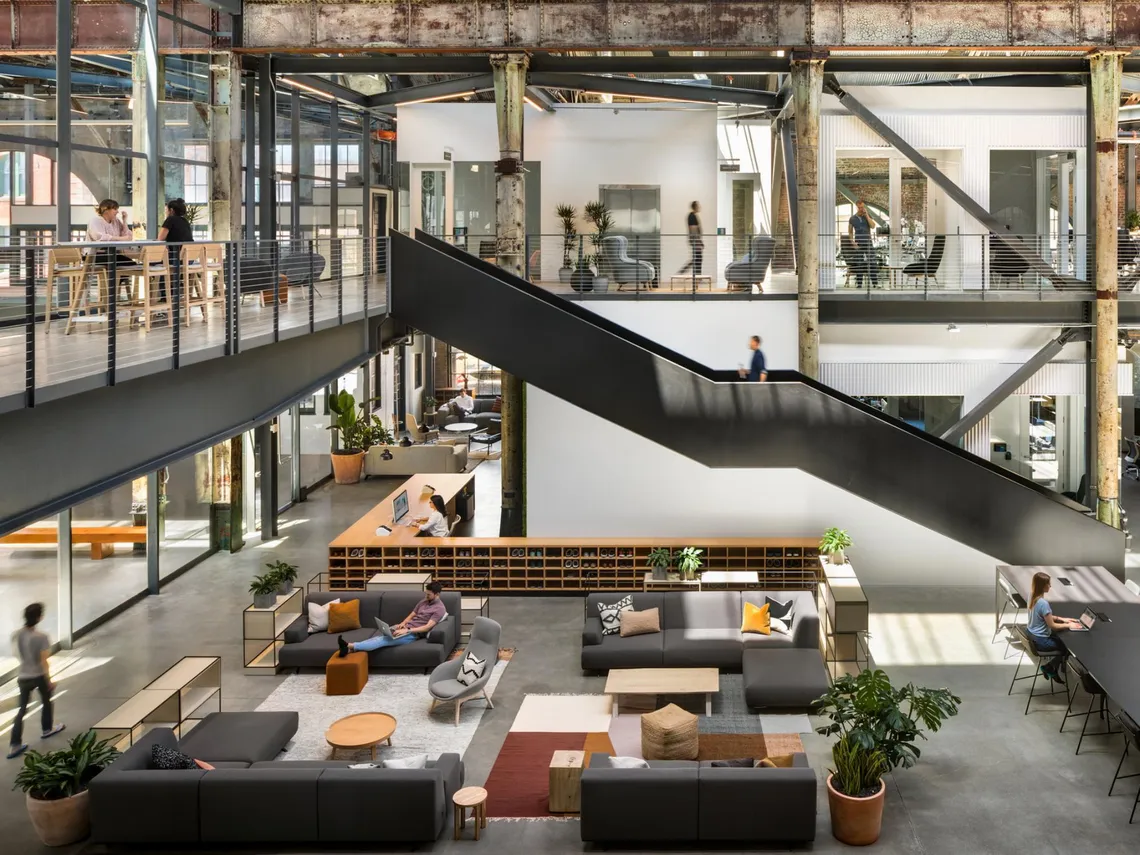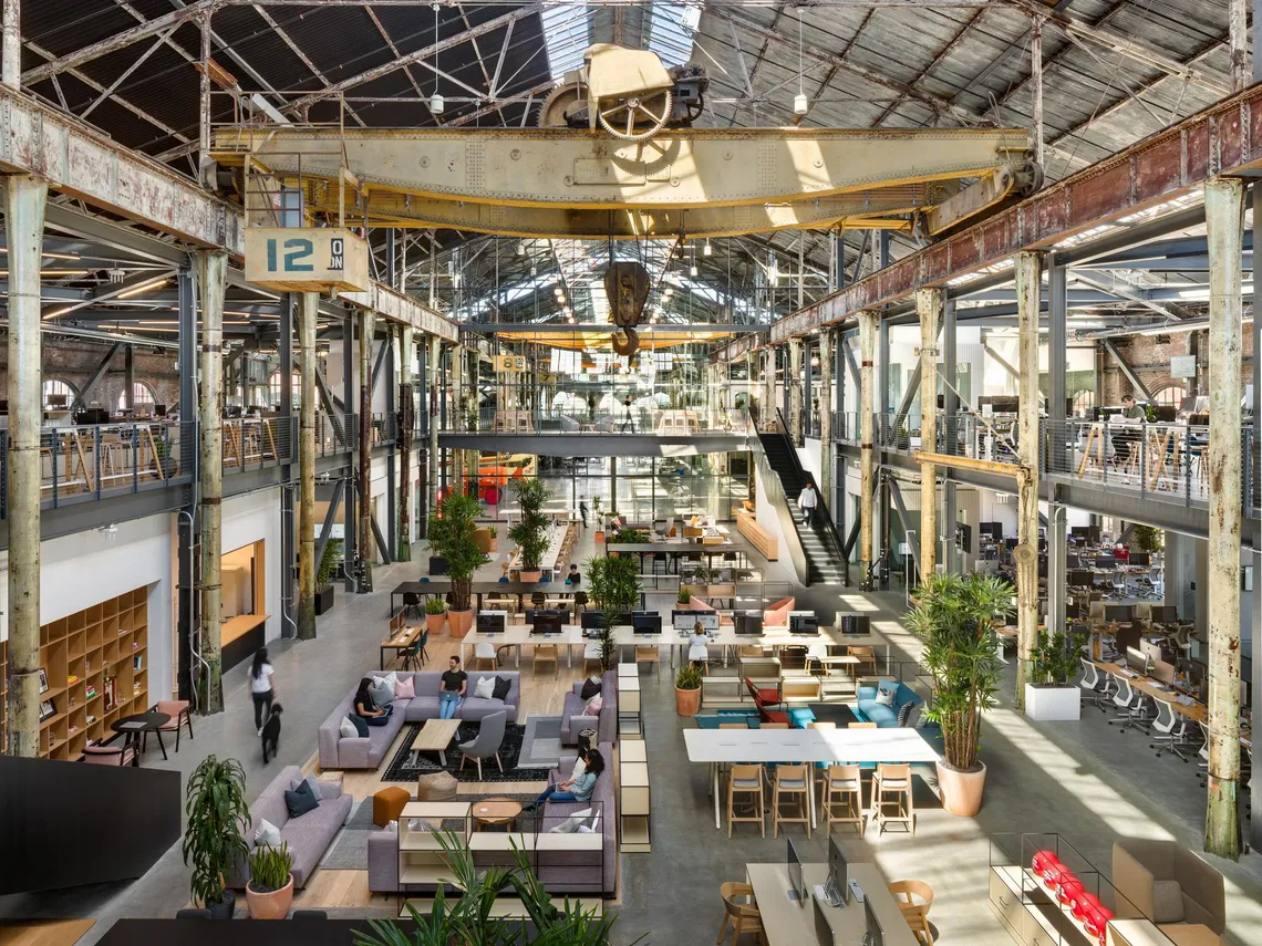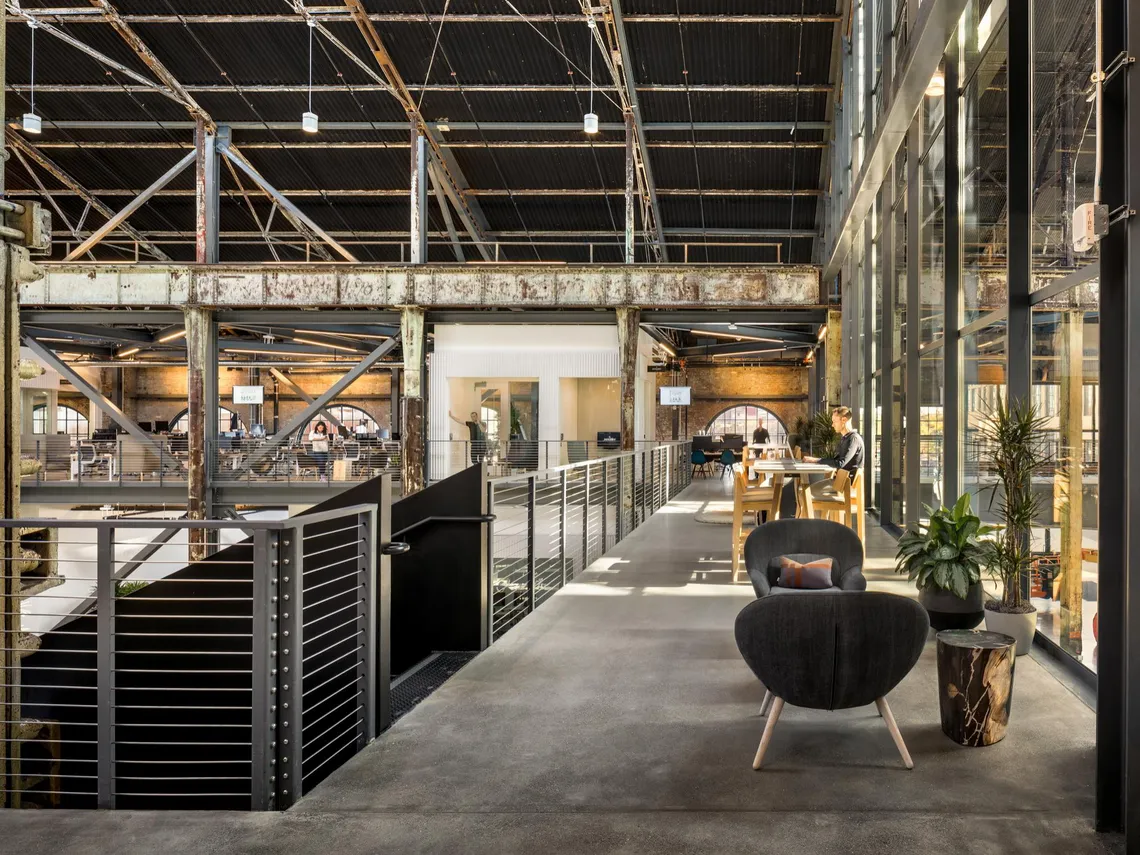 In the words of Gensler’s design manager Marcus Hopper, “This is basically a new building inside an old building.” Countless ships have been repaired in this 55,000 square-foot machine shop, going back to the days of the Spanish-American War of 1898, and Gensler decided to leave the old gantry cranes, lifts, pipes, beams and roofing as a visual focal point an also an homage to the past. In keeping with the building’s history, they designed the conference rooms to look like shipping containers; however, in keeping with the building’s bright future, these rooms have been named after some of Gusto’s 60,000 small business clients: the Bait and Tackle Shop, the Bakery, the Florist, the Gelateria, the Ramen Shop, and so on.