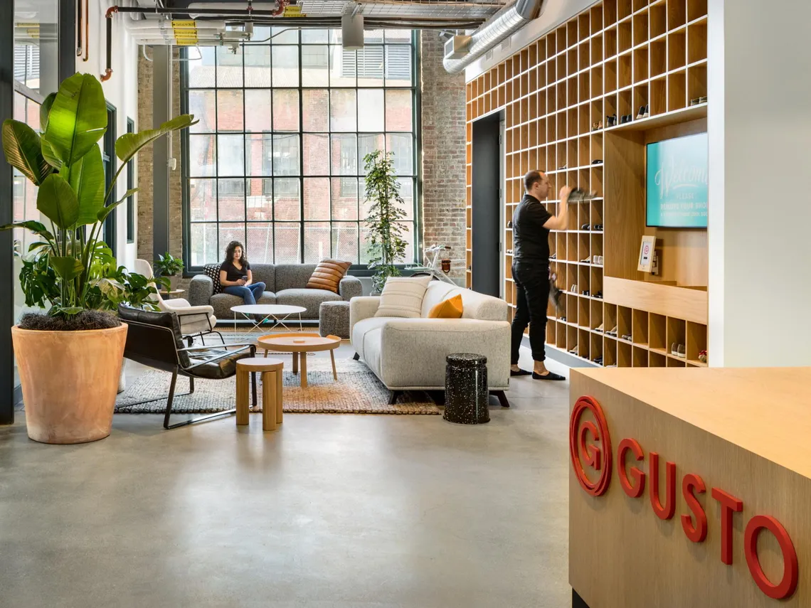 Gensler is committed to designing spaces that place the needs of employees first, and as such they involved Gusto staff in every stage of the process: team members helped come up with ideas like the heated floors and no-shoes policy, explored early designs in virtual reality, and even helped paint a 40-foot mural celebrating their customers. “We want our office to feel like a home,” explains Gusto’s CEO and co-founder Josh Reeves, “to be comfortable and authentic.”