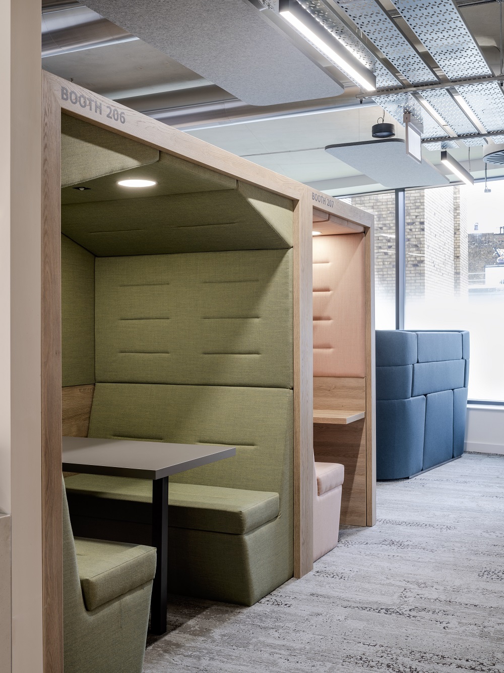 Piloting the scheme in different areas of the firm had revealed at least 21 different types of activities that were taking place, as well as a broad spectrum of personality types and preferences within the team. Space requirements were diverse and Kingsley Napley understood the variety of neighborhoods that would need to be created to fulfill these needs. Working with the design experts, KKS, we provided our Railway Carriage and Portals products to support these different spaces to work in.