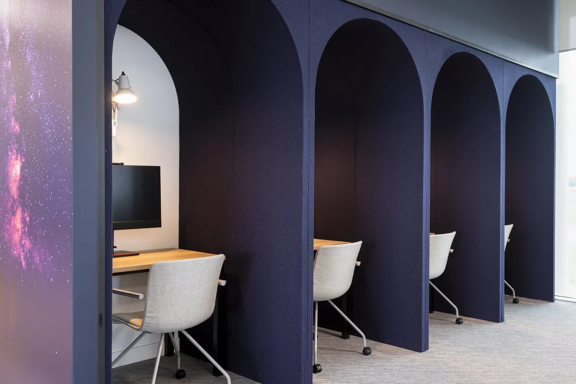 Spacestor worked closely with Area to provide semi enclosed working space created from one of their newest and most innovative products, Aeonica. The configuration features deep blue double depth arches which support Lenovo employees with acoustically sheltered workstations for focused work without being completely separated from the buzz. The choice in Aeonica ensures future reconfiguration, as pieces are joined with a quick release joining system allowing the product to be moved when space needs change and reconfigured rather than being thrown away.