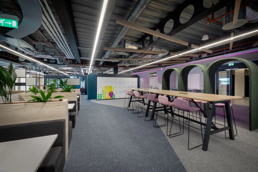 Employees can choose from various touchdown settings, pods for quiet work, team settings, meeting rooms and more. Desks for solo work occupy the office’s perimeter to maximise light and aid concentration – while more dynamic and collaborative settings are based in the core.