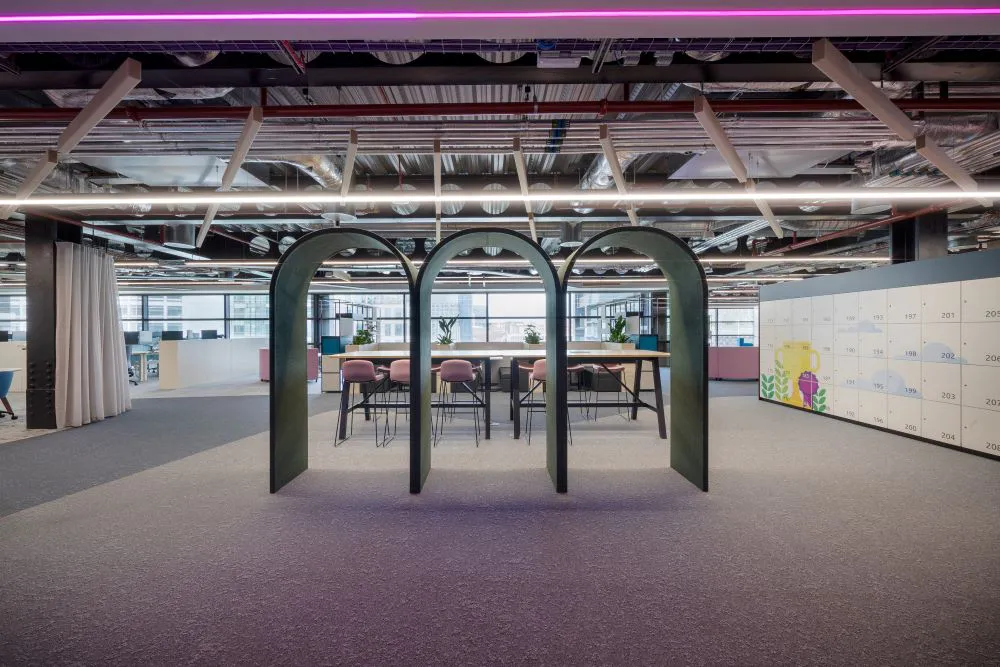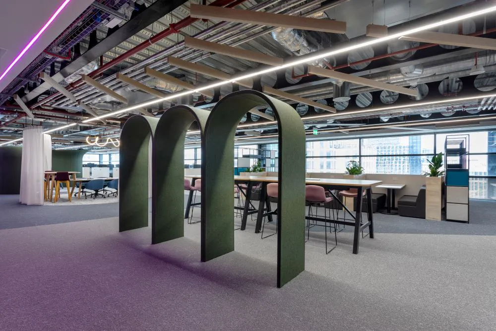 Organic curves and arches help to soften and zone the vast floorplate. They appear on the flooring, lighting, free-standing furniture, and meeting spaces and have even been used to create an arched welcome for employees. Spacestor provided the arches and curved collaborative space with Aeonica, their modular toolkit for the workplace.