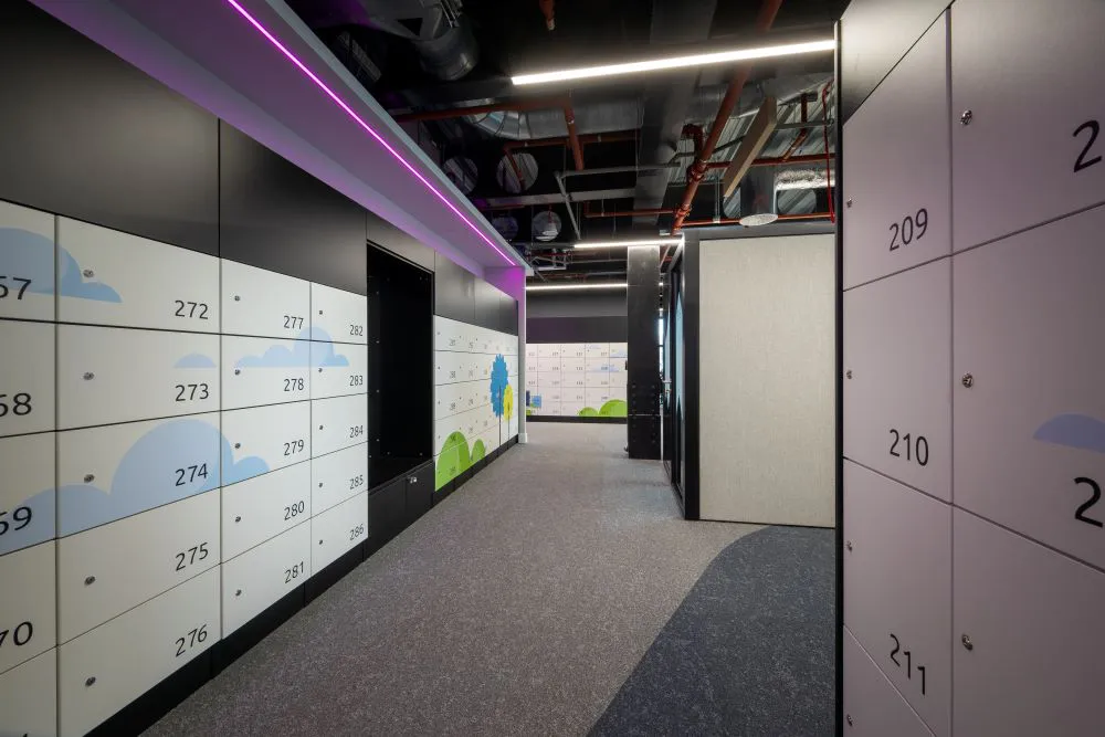 Spacestor also provided Storagewall and HotLocker solutions. These units cater to both general and personal storage needs, ensuring that employees have convenient access to their belongings in a fluid, agile environment. Bespoke graphics adhered to the front of the lockers add a unique touch, incorporating Mills & Reeve’s branding into the design. Additionally, Snugglestor, integrated into the locker runs, offer employees a comfortable spot to change their shoes or quickly catch up on their phone before heading out.