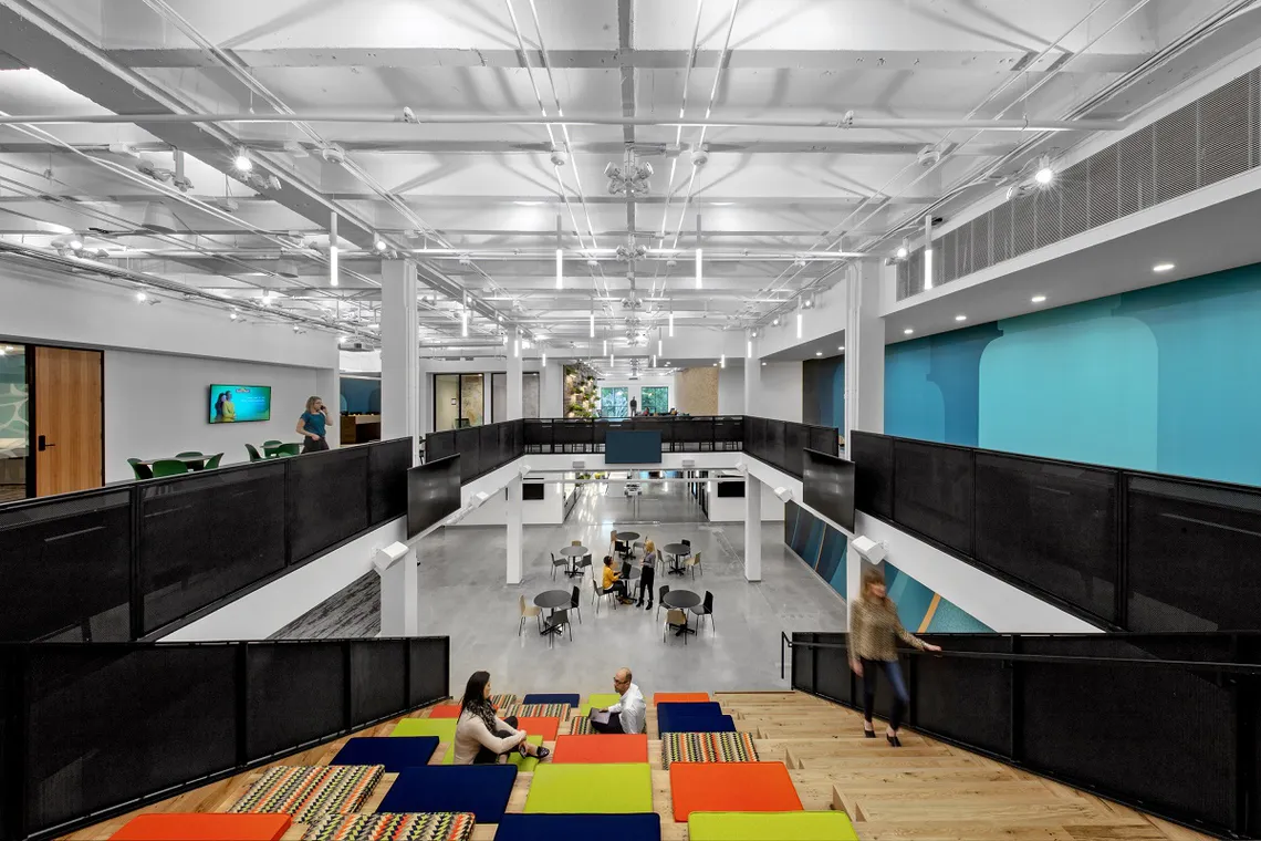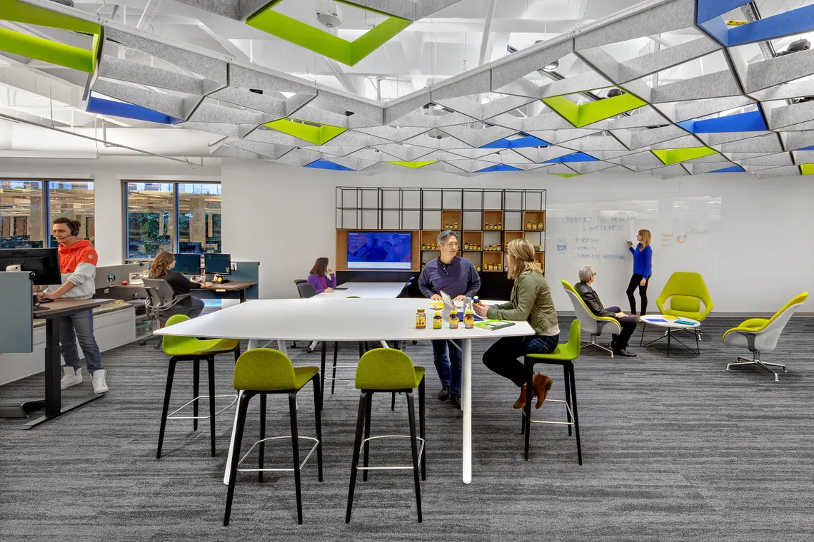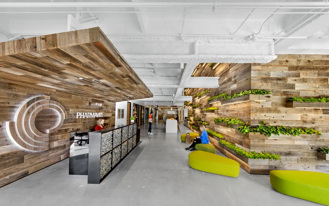 Pharmavite helps people live healthier lives and is focused on devising complete nutritional products that incorporate essential nutrients and minerals. They have won the trust of professionals and retailers in their field, as well as ensuring that their employees feel supported, and that wellbeing is at the forefront of the company's concerns. As part of this they partnered with HOK to create a striking space featuring a mix of geometric design, natural woods and biophilia, dark lines and bright color.