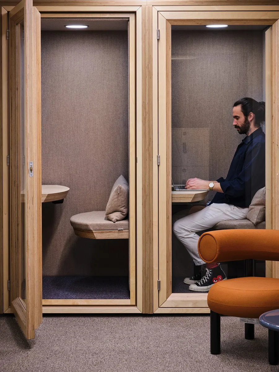Spaces for networking are configured throughout the space and divided by a glass wall, it's curvatures flow with an unprecedented feel. As well as provisions for collaboration, there are also offerings of quite spaces. Through by Bailey, Spacestor supplied multiple pods from their Residence range, which in birch ply, maintain the natural vibe and furnish employees with an iconic enclosure within the workplace, a serene sanctuary for focused work or private conversations.