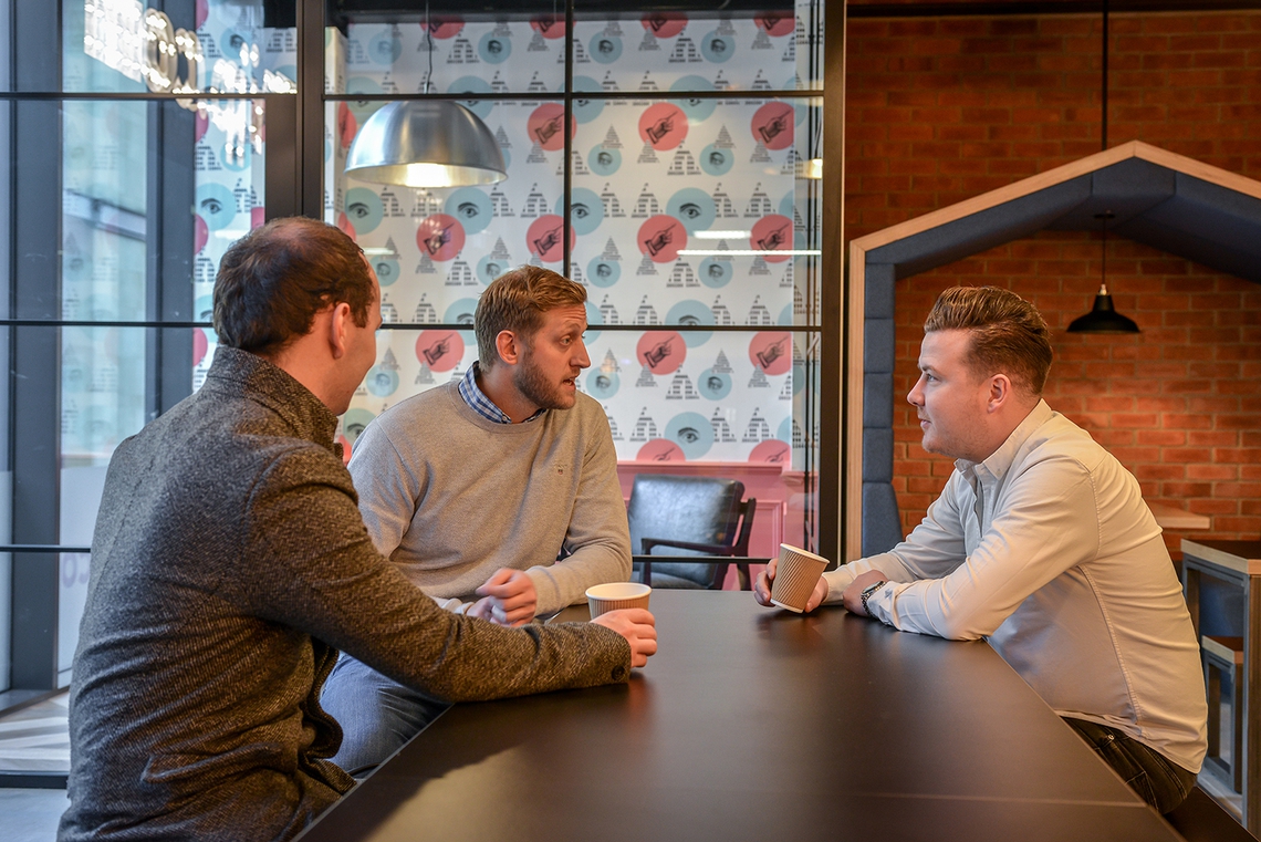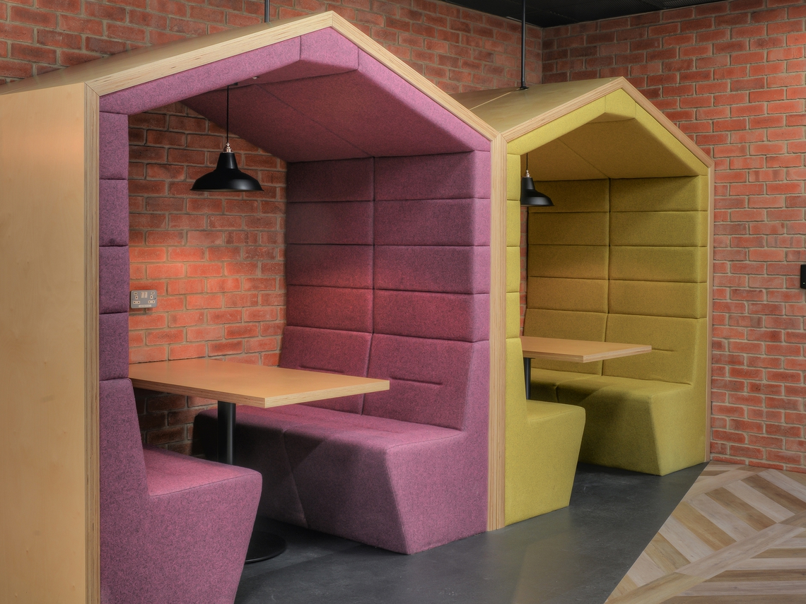 McCaffery’s designs were built by Scotwood Interiors and furniture experts at Bureau. Jim Scott, managing director of Scotwood Interiors, describes how, “From breakout areas, to the meeting and training rooms, to the open-plan space, every room and area is different.” Here at Spacestor, we were pleased to supply some of the key architecture making such variety possible: a warm Palisades Grid zone divider filled with hanging halogen lights and plants, a wood-finish Storagewall run with a light green, recessed Snugglestor seating area, and two pairs of Railway Carriage meeting pods with pitched roofs; perfect places in which to plan the future of travel.